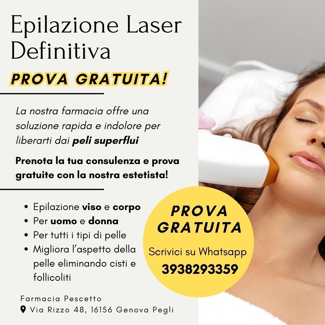 Presso la Farmacia puoi dire addio ai peli superflui grazie ai nostri trattamenti di epilazione laser definitiva. Una soluzione rapida, indolore ed efficace, pensata per chi desidera risultati duraturi senza ricorrere a metodi tradizionali. Il servizio prevede un primo appuntamento con consulenza personalizzata e prova gratuita, per valutare al meglio le tue esigenze.