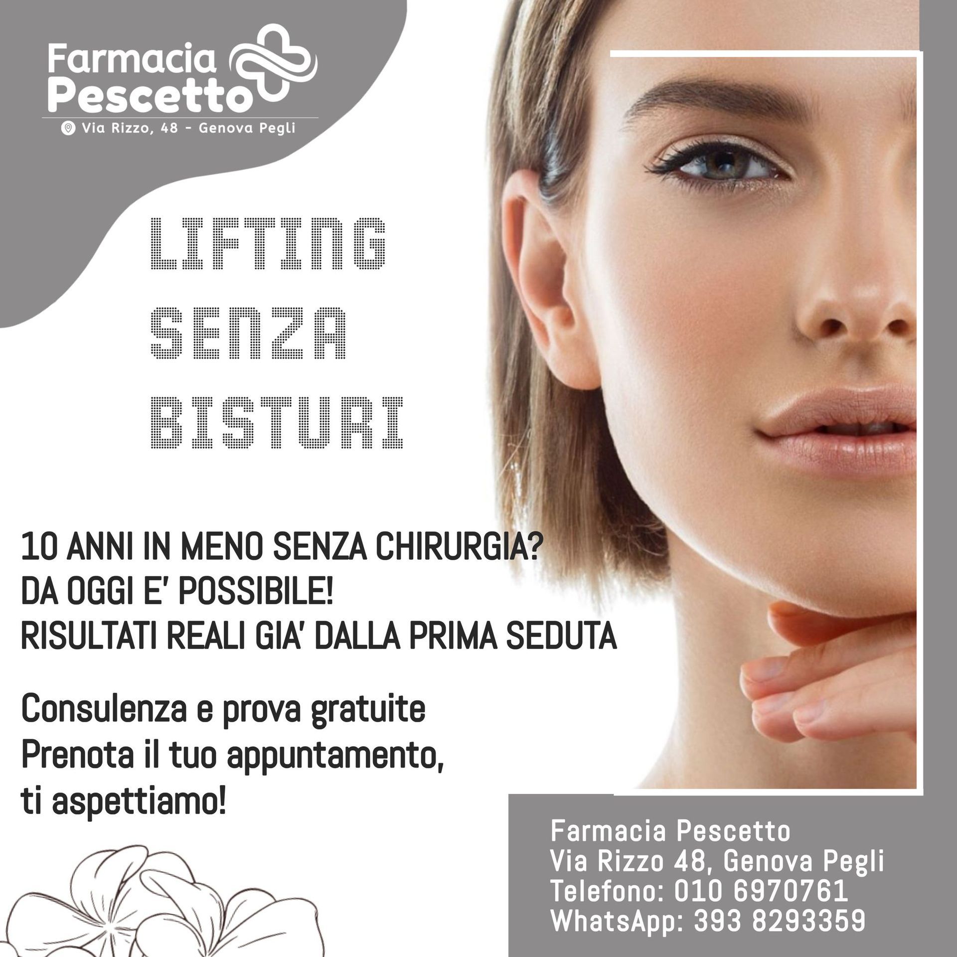 La Farmacia Pescetto offre un’ampia gamma di trattamenti estetici viso e corpo per rispondere a diverse esigenze. Disponibili pulizia del viso, trattamenti con apparecchio Teslamed per rughe e macchie, "blefaro" non chirurgica, e il Manual Lifting, un massaggio specifico che dona effetto lifting naturale. Con la pressoterapia favoriamo il drenaggio e il benessere circolatorio.